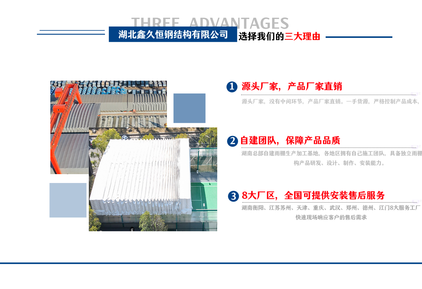 湖北鑫久恒鋼結(jié)構(gòu)有限公司是一家電動(dòng)雨棚、膜結(jié)構(gòu)車棚研發(fā),生產(chǎn)銷售,施工安裝于一體的專業(yè)鋼結(jié)構(gòu)科技公司,主要產(chǎn)品有伸縮雨棚,電動(dòng)雨棚,膜結(jié)構(gòu)車棚等。 湖南地區(qū)職員目前有80多人,占地面積20000平方米,廠房面積15600平方米,配備先進(jìn)的生產(chǎn)流水線,使每件品質(zhì)產(chǎn)品的堅(jiān)實(shí)基礎(chǔ)。 公司在蘇州、天津、重慶、武漢、德州、烏魯木齊、江門均設(shè)有服務(wù)工廠,總?cè)藛T共300多人,擁有專業(yè)的技術(shù)團(tuán)隊(duì),配備先進(jìn)的設(shè)備和流水線生產(chǎn),產(chǎn)能高,貨源充足,發(fā)貨速度快,服務(wù)區(qū)域廣。 移動(dòng)伸縮棚適用于通道臨時(shí)倉(cāng)儲(chǔ)、戶外運(yùn)動(dòng)遮陽(yáng)、污水池遮蓋、能源交通、熱力化工、礦山、船舶制造及市政建設(shè)、物流、碼頭等領(lǐng)域的構(gòu)件制作加工,成品半成品存放、倉(cāng)庫(kù)、野外儀器設(shè)備操作用房等。尤其是對(duì)工廠發(fā)貨、倉(cāng)儲(chǔ)臨時(shí)遮雨防嗮,梅雨期較長(zhǎng)、建設(shè)周期較短的工程施工等特別適用。還可根據(jù)用戶需求量身定制、適合企業(yè)所需不同款式的產(chǎn)品。 我公司堅(jiān)持“誠(chéng)信社會(huì)為本,客戶滿意為榮”的經(jīng)營(yíng)理念,做到質(zhì)量把控,嚴(yán)格管理,精益求精,恪守承諾。使鑫久恒逐步走向成熟,其系統(tǒng)化、專業(yè)化日趨完善。以專業(yè)的技術(shù)、科學(xué)的管理,更高的產(chǎn)品質(zhì)量,優(yōu)良的企業(yè)信譽(yù),真誠(chéng)的客戶服務(wù),靈活多樣的經(jīng)營(yíng)方式和務(wù)實(shí)創(chuàng)新的企業(yè)精神愿與社會(huì)各界攜手合作,為推動(dòng)智能鋼結(jié)構(gòu)建筑事業(yè)的發(fā)展而不斷努力。...